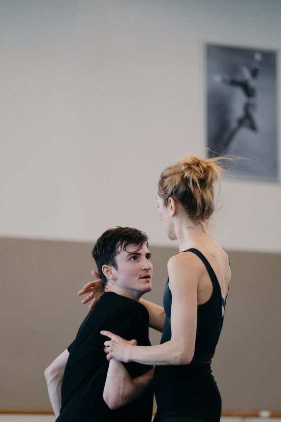 During rehearsals for Mere Mortals, dancers Jennifer Stahl and Parker Garrison step into the roles of Pandora and Epimetheus with the guidance of choreographer Aszure Barton.