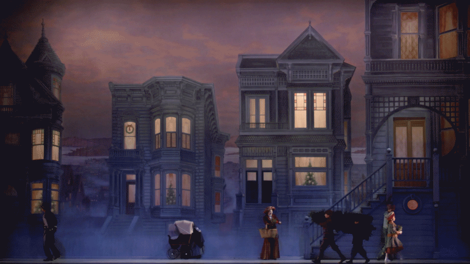 When the curtain rises on Nutcracker, we’re welcomed with a street scene of classic Victorian San Francisco. The famous Painted Ladies of Alamo Square, where the Stahlbaum Family lives, are front and center. These colorful, historic homes in the iconic row at Alamo Square, just up the street from our studios and Opera House, were constructed during the 1890s to the early 1900s, when the Victorian architectural style was at its peak in the city. During the prologue, watch for the detailed interactions between passersby in the 1915 street scene.