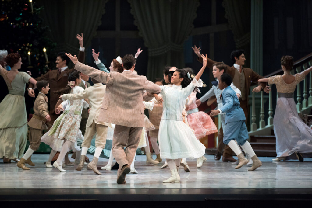In the Stahlbaums’ sitting room, family and friends merrily trim the tree. Clara, Fritz, and their friends descend the staircase to see—for the very first time—electric lights glowing on their Christmas tree! The children jump with glee. As they play with new Christmas toys, Dr. Stahlbaum invites the guests to dance. Clara joins the adults, dancing with her father.
